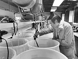 Through research carried out by University of Washington Fisheries Professor Kenneth Chew and his colleagues, Washington state has become one of the nation's top three producers of oysters. Chew is perhaps best known for developing the triploid Pacific oyster, which doesn't become "mushy" during the summer spawning season. Triploid oysters have been genetically altered using controlled applications such as heat, pressure, or a chemical, so that they are reproductively inactive - virtually sterile - in summer months when other oysters are spawning. Triploids attain a larger size than normal, or diploid strains. |