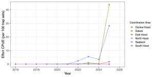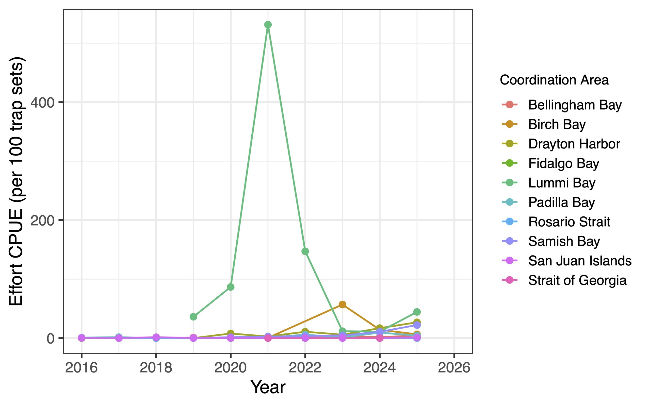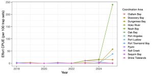 - Changes across North Puget Sound were mixed in 2025. Catch rates increased at some sites and declined at others, with the clearest increases at sites that already supported larger populations, including Drayton Harbor, Samish Bay, and Lummi Bay.