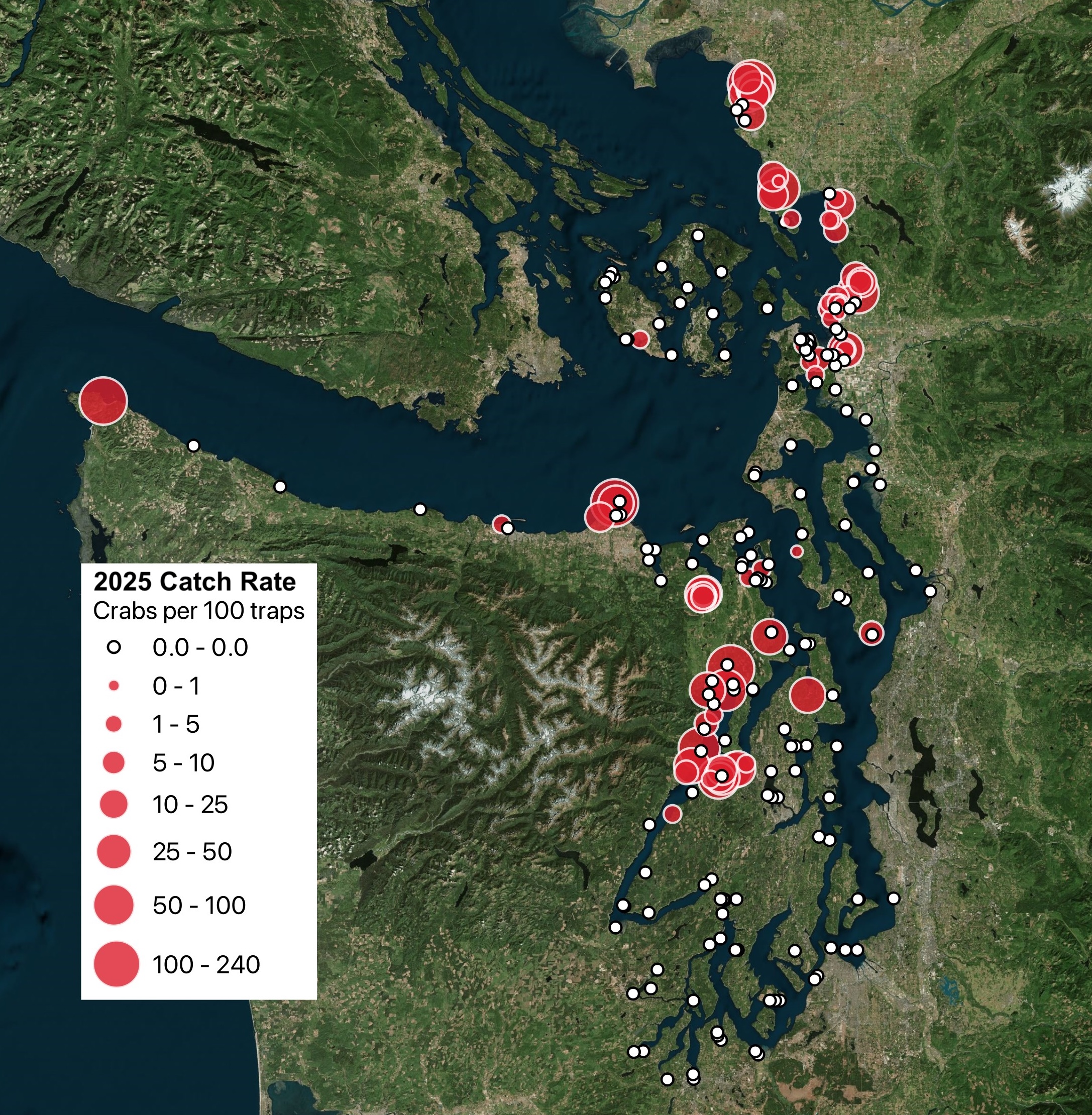 Map of 2025 annual average catch rate, number of crabs captured per 100 trap sets. Note that this figure shows only data from trapping effort and does not include molts, dead, or hand captured crabs. Notably, the single crab captured in Possession Sound in 2025 by Tulalip Tribes does not appear on this figure. Click to enlarge
