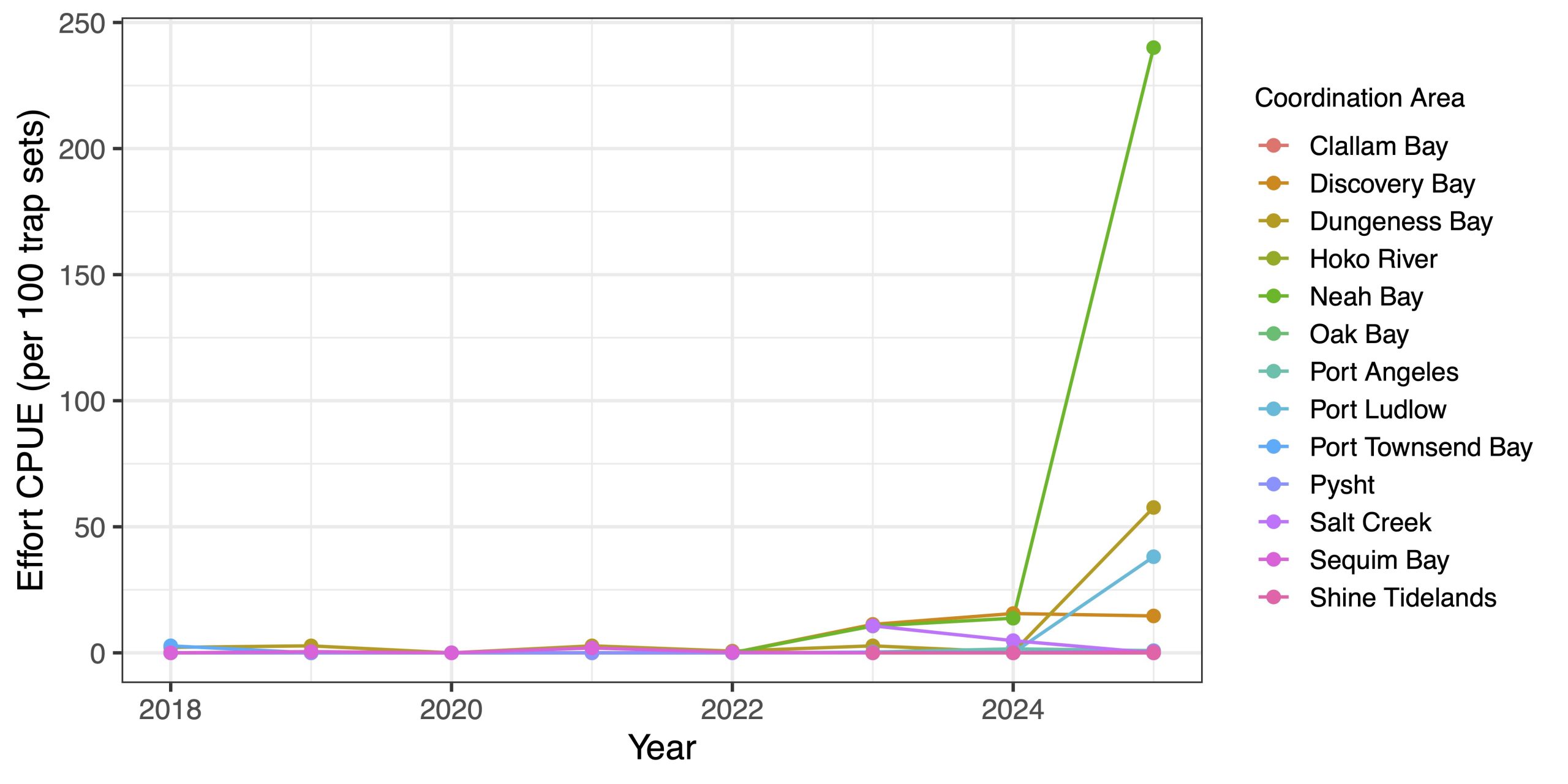 - The Makah Tribe first documented notable green crab numbers in Neah Bay in 2024. In 2025, catch rates increased nearly tenfold. Large numbers of young crabs were observed in late spring—a pattern more typical of Pacific coast estuaries (such as Makah Bay, Willapa Bay, and Grays Harbor) than of most Salish Sea sites, where recruitment is usually detected later in the summer.