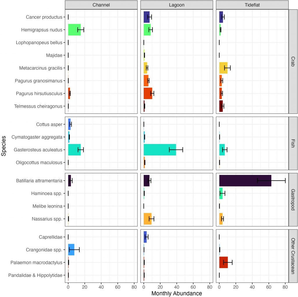 A new Crab Team paper aimed to do just that, and we’re pleased to share these hot-off-the-[virtual] presses findings. Former Crab Team postdoc, Ben Rubinoff, led the analysis and subsequent paper titled, “High-resolution monitoring of Salish Sea estuarine communities through participatory science” and it appears in the most recent issue of Frontiers in Marine Science.